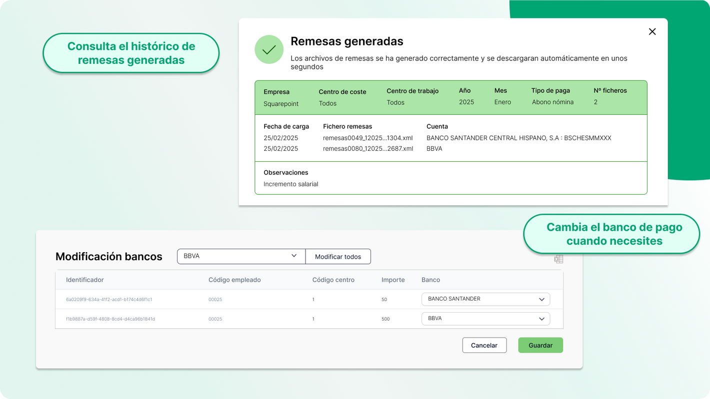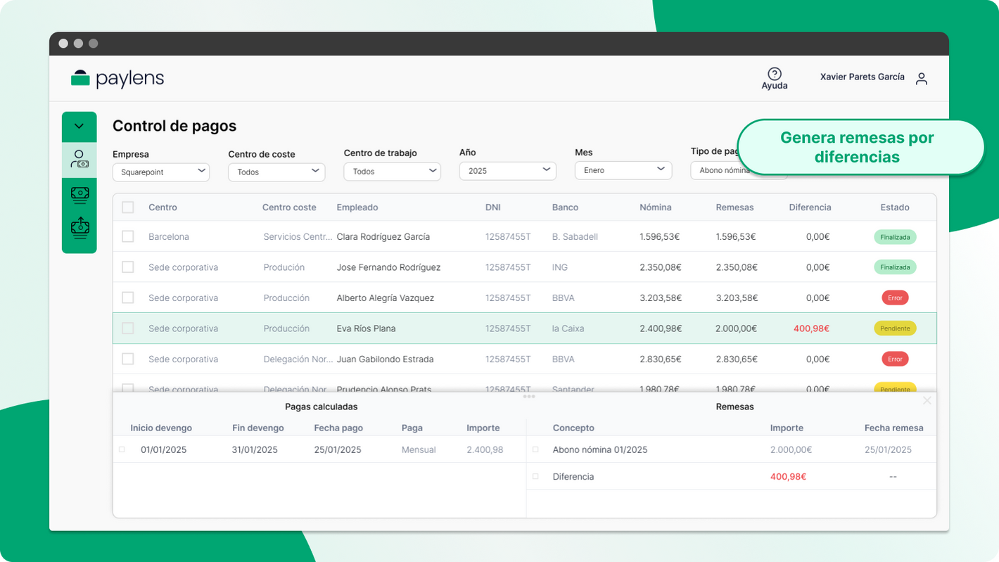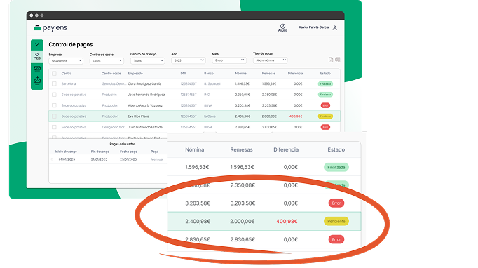 Elimina el factor error en la gestión de remesas, automatiza el proceso y asegura el control de pagos gracias a la trazabilidad de diferencias monetarias. Simplifica la gestión de pagos con PayLens, un complemento de a3innuva Nómina, totalmente integrado con el programa de nóminas para mejorar la eficiencia de la administración de pagos y eliminar tareas manuales innecesarias en sólo un clic.