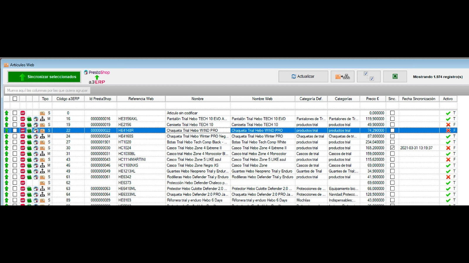 Aplicación que conecta a3ERP con tu tienda online PrestaShop. Sincroniza los artículos de a3ERP desde un entorno amigable. Todos los campos se completarán con los del ERP ahorrando tiempo y evitando errores. Además, todos los pedidos que realicen desde PrestaShop aparecerán en a3ERP. La aplicación va de la mano junto al ecosistema de PrestaShop. Toda la información se nutre de una única plataforma y el trabajo se realiza casi al 100% desde a3ERP.
